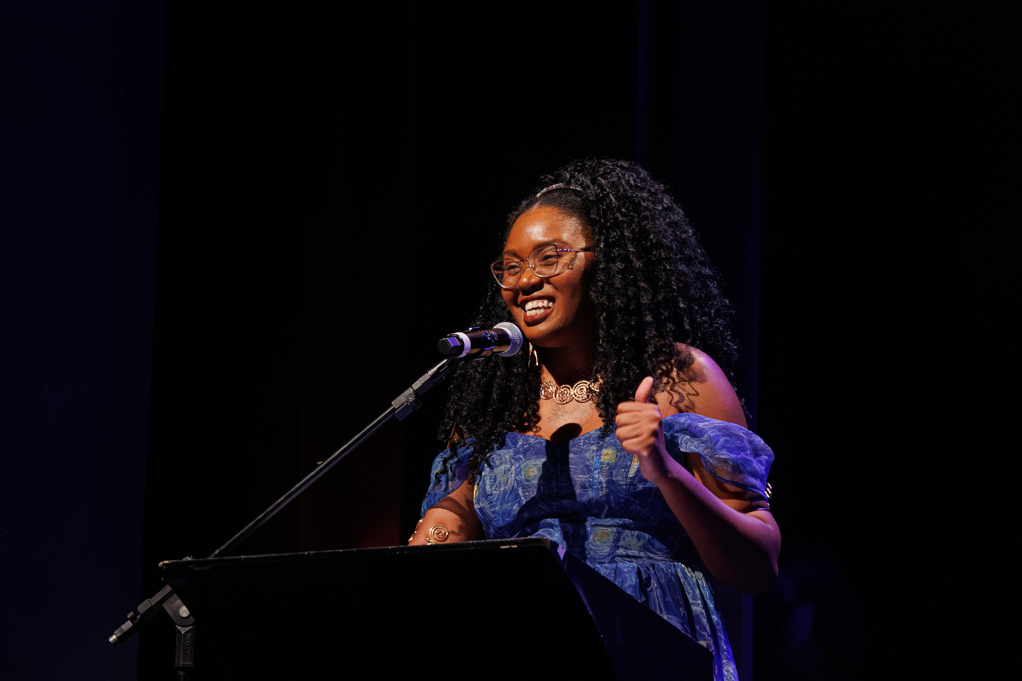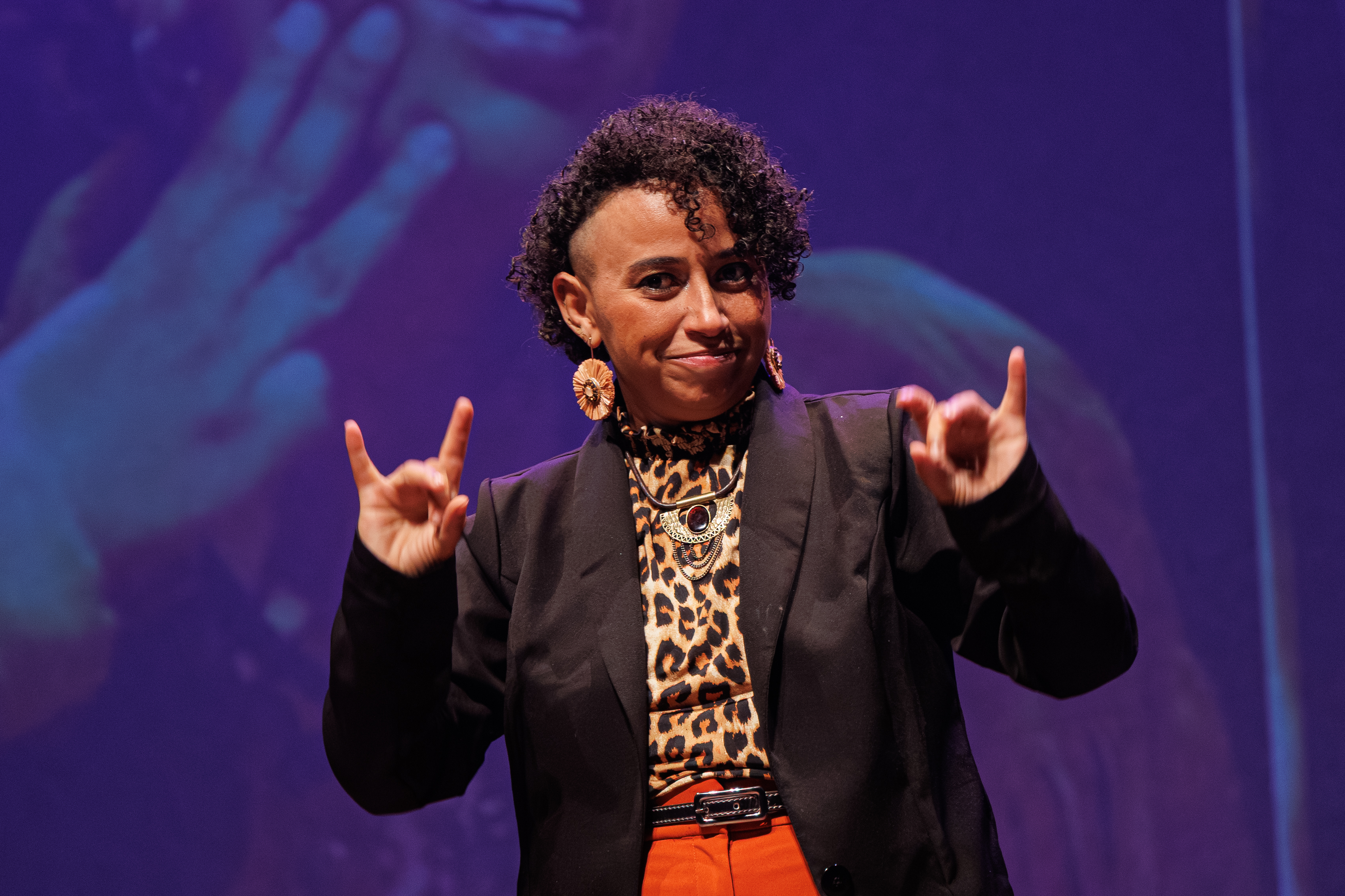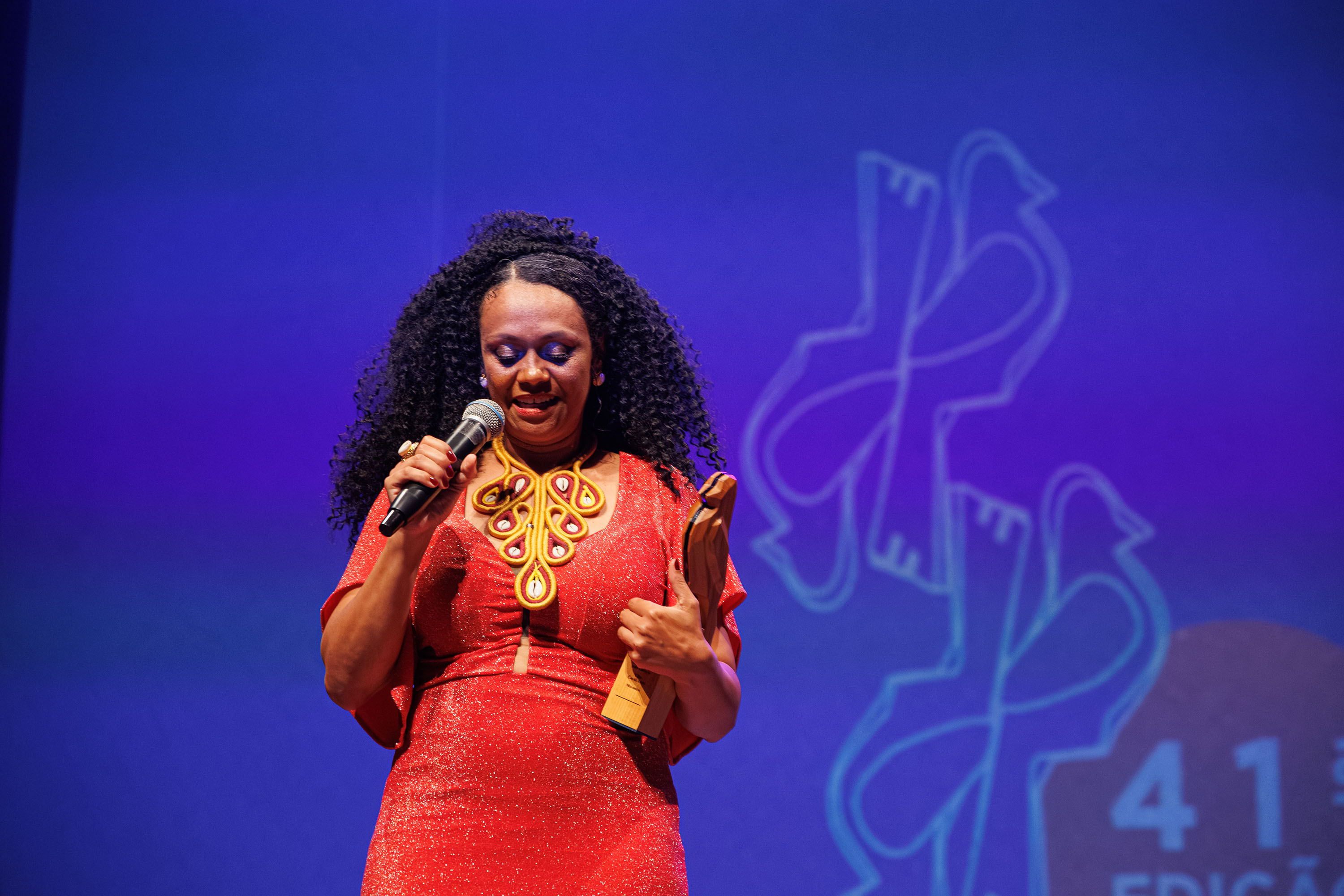 “Estou extremamente emocionada e agradecida como surda de estar aqui representando a minha comunidade. O Teatro Guaíra é centenário e importante e, quando era pequena, me apresentei aqui uma vez, ganhei vários aplausos e estou aqui novamente, com o sonho realizado de estar aqui como artista, me orgulhando e recebendo este prêmio, meu coração está repleto de alegria”, disse.